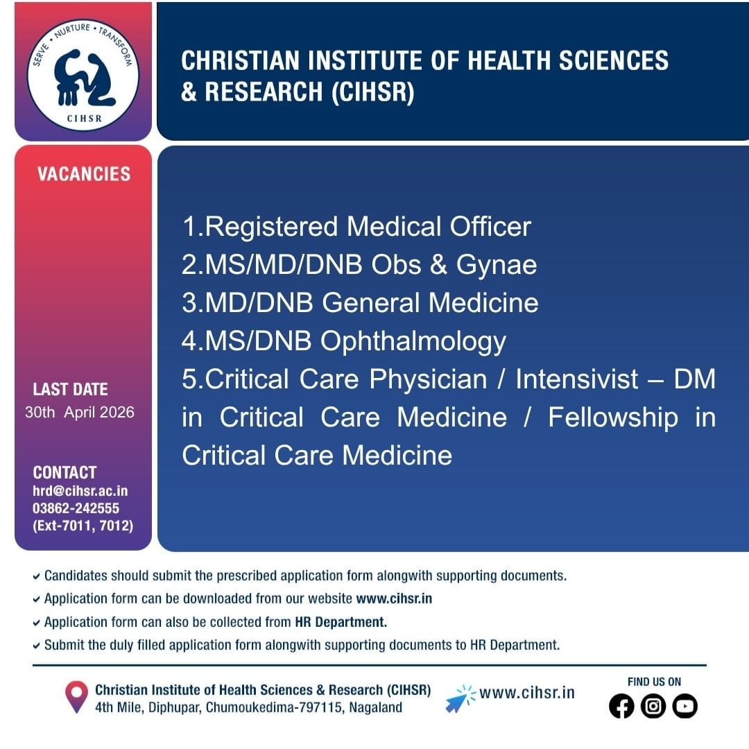 Candidates should submit the prescribed application form along with their supporting documents and email it tohrd@cihsr.ac.in or submit it to HR Department by the last date of submission. The application form is available for download below, fill in the details, and mail it back to the above email address.